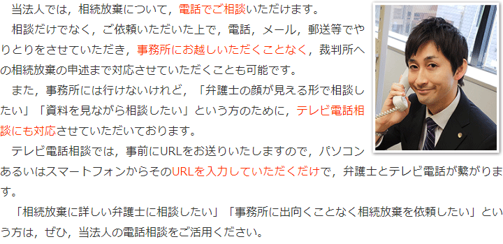 トップその他相続放棄の電話相談・テレビ電話相談 階層構造▼ その他(目次) 相続放棄の電話相談・テレビ電話相談 その他(目次)その他トップ共通バナー※消さない心グループニュース相続放棄の電話相談・テレビ電話相談弁護士費用(詳細)費用の安さにこだわる理由お客様相談室お役立ちリンク集関連リンク集プライバシーポリシー 受付時間 平日 9時~21時、土日祝 9時~18時 夜間・土日祝の相談も対応します (要予約) 所在地 〒251-0052 神奈川県藤沢市藤沢973相模プラザ第3ビル2F 0120-41-2403 お問合せ・アクセス・地図